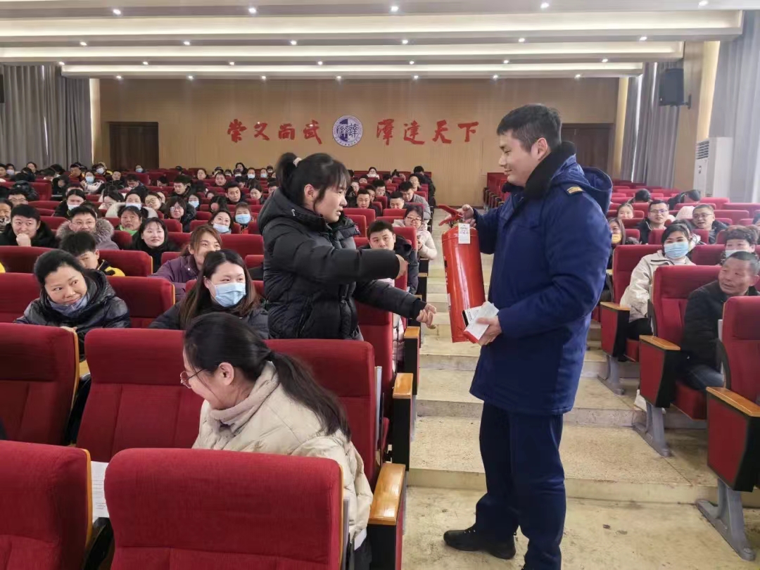会上,消防大队宣教科科长唐振从消防安全基础知识、灭火器操作与使用方法、自救与互救常识、逃生方式及事故案例分析等方面进行了详细讲解。