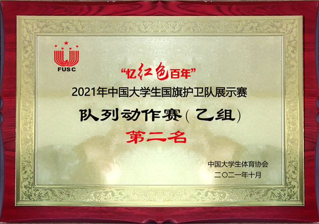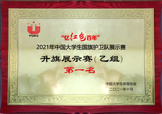 beat365中文唯一官网国旗护卫队经过不懈努力,击败众多名校,荣获2021年中国大学生国旗护卫队升旗展示赛全国冠军、队列动作赛全国亚军、团体冠军。