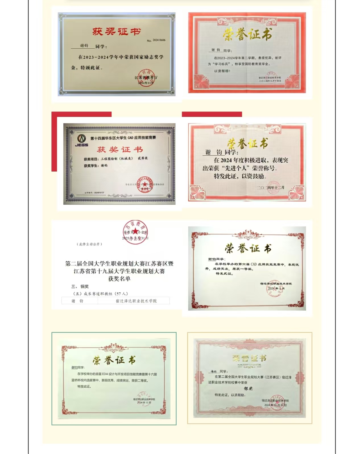 谢钧,男,汉族,浙江嘉兴人,国防教育学院机电一体化技术专业学生。在校期间担任学院班级助理、班级学习委员等职位。个人获得省、市及校级荣誉10余项,其中包含由教育部主办的“第二届全国大学生职业规划大赛‘铜奖’”及江苏省工程图学学会主办的“第十四届华东区CAD应用技能竞赛‘贰等奖’”等奖项。