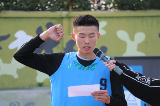 王德耀同学作为运动员代表宣誓,表示比赛中会遵守比赛规则,遵守赛场纪律,尊重裁判,尊重对手,听从指挥,服从安排。