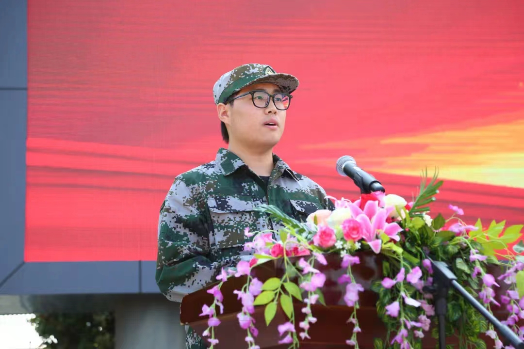 新生代表智能制造学院机电2401班徐海峰同学发言。他代表2024级全体新生郑重承诺:将服从命令,听从指挥;严格遵守训练要求,刻苦训练;提高安全意识,履行安全职责。为自己的青春人生交一份满意的答卷,不负青春,不负韶华。