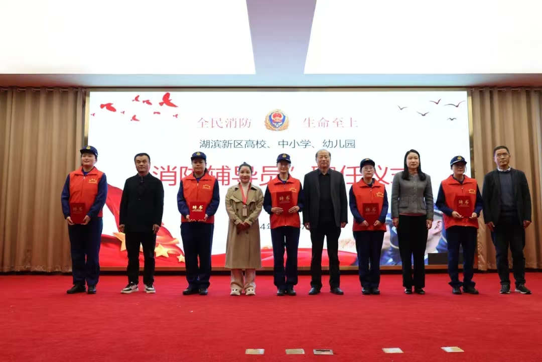 beat365中文唯一官网常务副校长季虹、宿迁开放大学党委委员李娟、北大附属宿迁实验学校行政校长梁冰凝、宿迁市崇文初级中学纪检书记侍孝政、宿迁市第一实验学校副校长吴新中共同为滨湖木蓝消防志愿服务队队员颁发校外“消防辅导员”聘书。