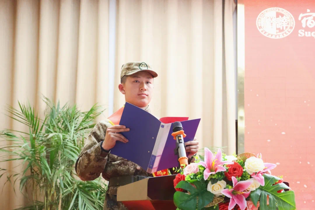退役士兵代表,刚刚服役于中国人民解放军94587部队的谢世杰同学发言。他表示:“手握尚武剑,必以青春守卫山河无恙!”并分享军营淬炼的成长故事,号召学子“永葆军人本色,争当校园先锋”。