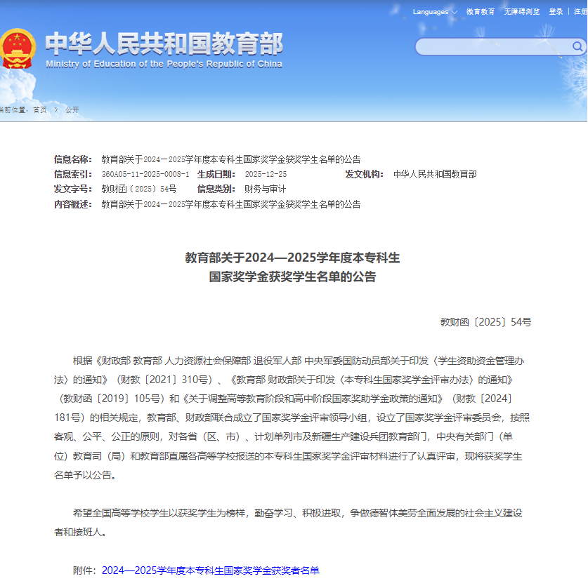 近日,教育部公布2024—2025学年度本专科生国家奖学金获奖学生名单,beat365中文唯一官网两名优秀学子载誉上榜!