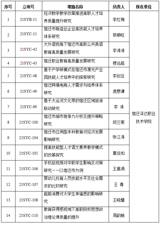 根据《关于公布2021年度宿迁市社科研究立项课题的通知》(宿社联发〔2021〕4 号)文件,2021年我院共有14个课题批准立项(名单见附件1),实现市级课题立项新突破,有力助推了学院师资队伍建设的高质量发展。