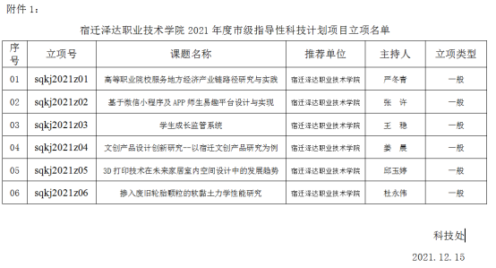 根据《关于组织申报2021年度市级指导性科技计划项目的通知》(宿科发〔2021〕62号)文件,2021年我院共有6个项目批准立项(名单见附件1),实现市级指导性科技计划项目立项新突破,有力助推了学院师资队伍建设的高质量发展。