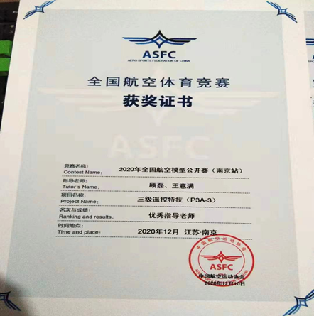 由国家体育总局航管中心ASFC(中国航空运动协会)主办的2020年全国航空体育竞赛航空模型公开赛(南京站)在南京市进行竞赛,汽车工程系无人机应用技术专业杨雨杰同学喜获佳绩,首次获得三级遥控特技(P3A-3)第二名的好成绩。