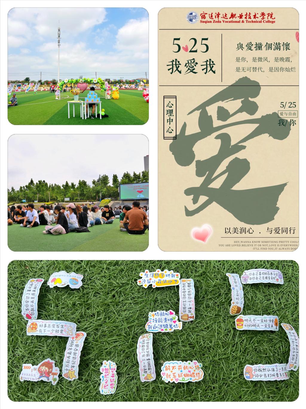 每年的5月25日是全国大学生心理健康节,“5.25”谐音“我爱我”。为倡导大学生关爱自我、了解自我、接纳自己,关注自己的心理健康和心灵成长,提高自身心理素质,培养爱与被爱的能力,从而更好地爱人爱己。5月21日,大学生心理健康教育与咨询中心在学校西操场举办了“‘5.25 我爱我’心理健康节系列主题活动”。
