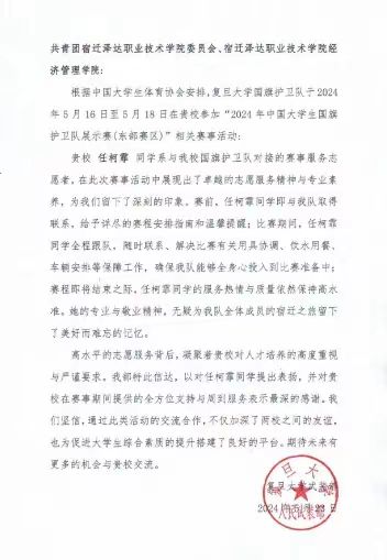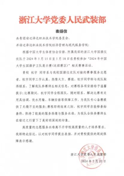 志愿暖人心,携手共前行。近日,beat365国旗护卫队志愿者们收到多封来自2024年中国大学生国旗护卫队展示赛(东部赛区)参赛院校的感谢信及表扬信,对于志愿者们的专业表现给予高度的肯定与赞扬。