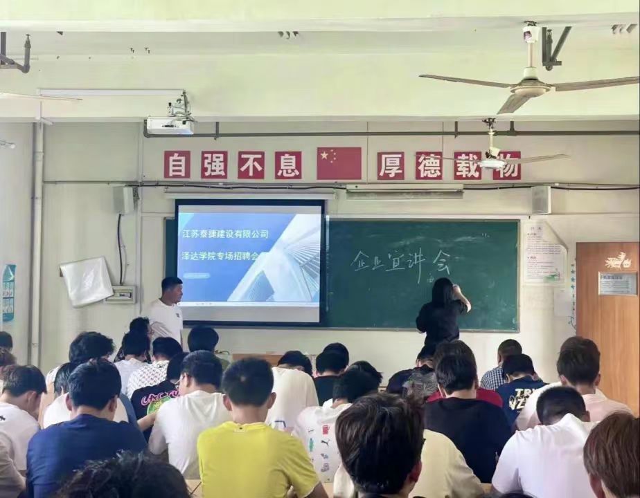 江苏泰捷建设有限公司代表通过PPT展示以及面对面交流的方式,就企业背景、企业文化和工程项目案例等方面做了详细介绍。现场同学们积极咨询相关岗位薪资以及职业前景、实习要求等,初步达成就业意向20余人。
