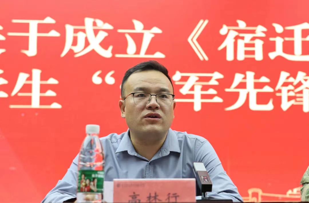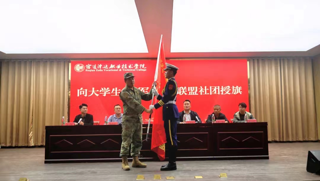 宿豫区人武部军事科科长王介聪为大学生“学军先锋”联盟授旗。