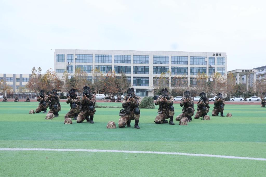 此次军事特色科目考核分为技能考核和体能考核,内容包括防爆队形、班排战术、国旗护卫队展示、擒敌拳、军体拳、对刺。考核现场,全体师生统一身着迷彩服,个个精神抖擞、不畏严寒,教官以身作则,率先垂范,考官严肃认真、公平公正。