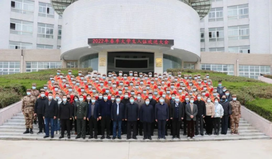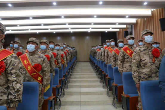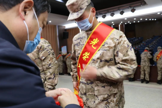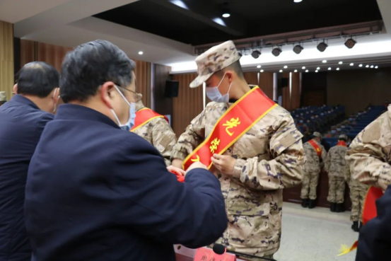 校领导及部门负责人为新兵戴花绶带,激励新兵砥砺前行、建功军营,为实现新时代强军目标贡献力量,全体新兵高举右手,庄严宣誓,他们用洪亮的声音高喊出永远忠于党、忠于祖国、忠于人民的铮铮誓言,立志扎根军营,报效祖国,以英模为榜样。