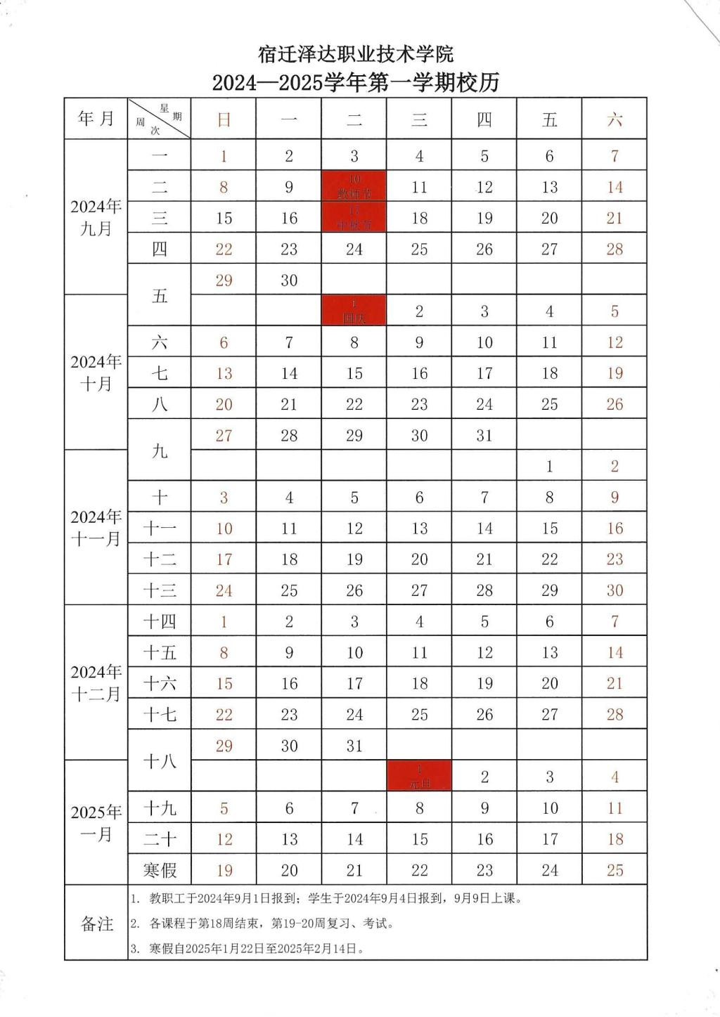 2024—2025学年第一学期校历