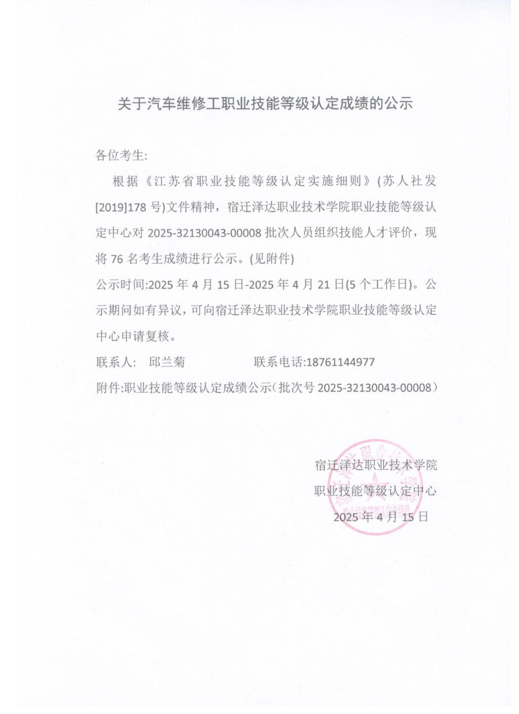 职业技能等级认定成绩公示(批次号2025—32130043—00008)