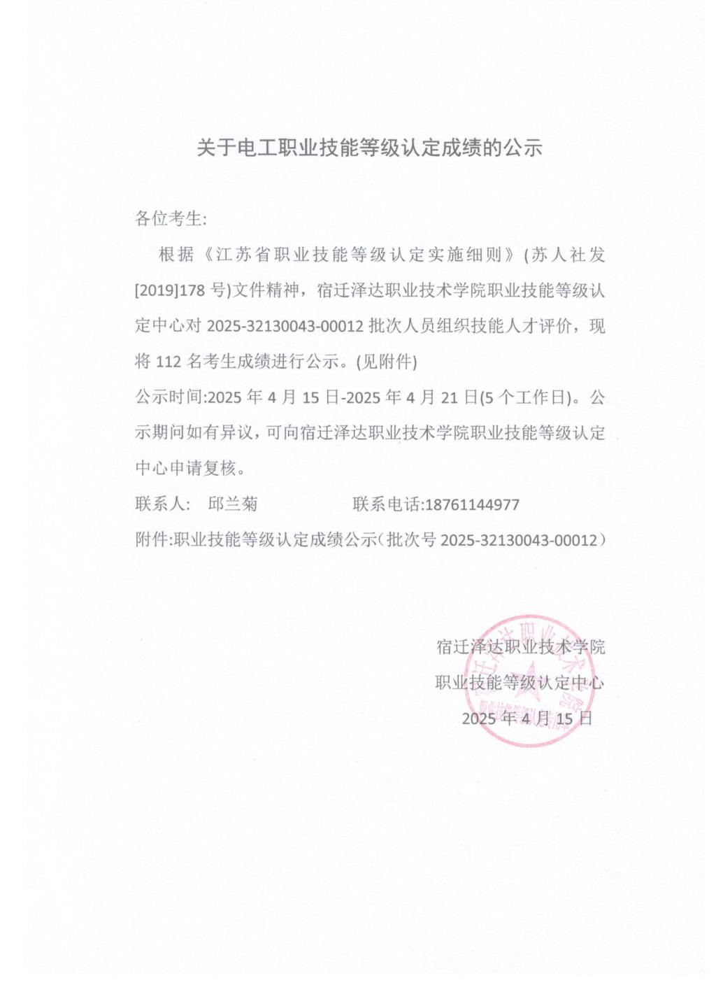 职业技能等级认定成绩公示(批次号2025—32130043—00012)