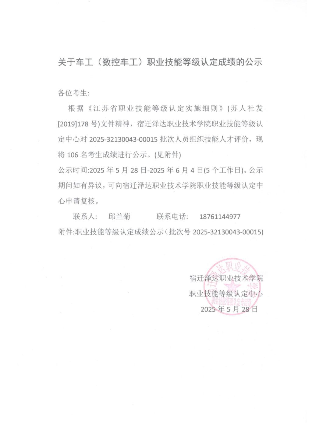 职业技能等级认定成绩公示(批次号2025-32130043-00015)