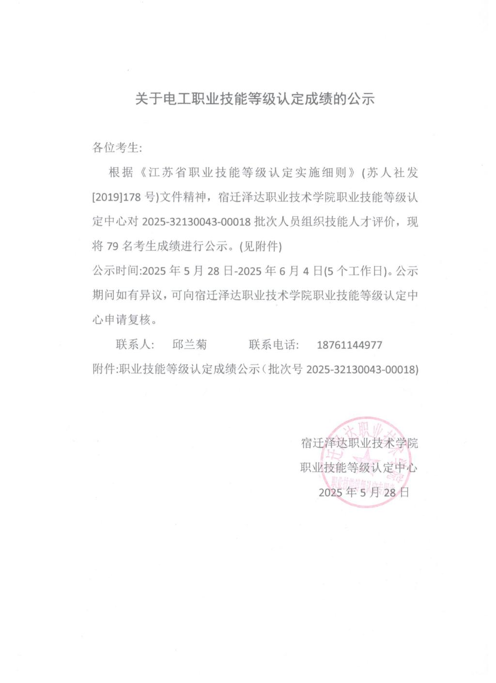 职业技能等级认定成绩公示(批次号2025-32130043-00018)