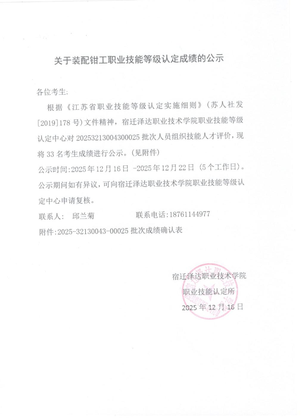 职业技能等级认定成绩公示(批次号2025-32130043-00025)