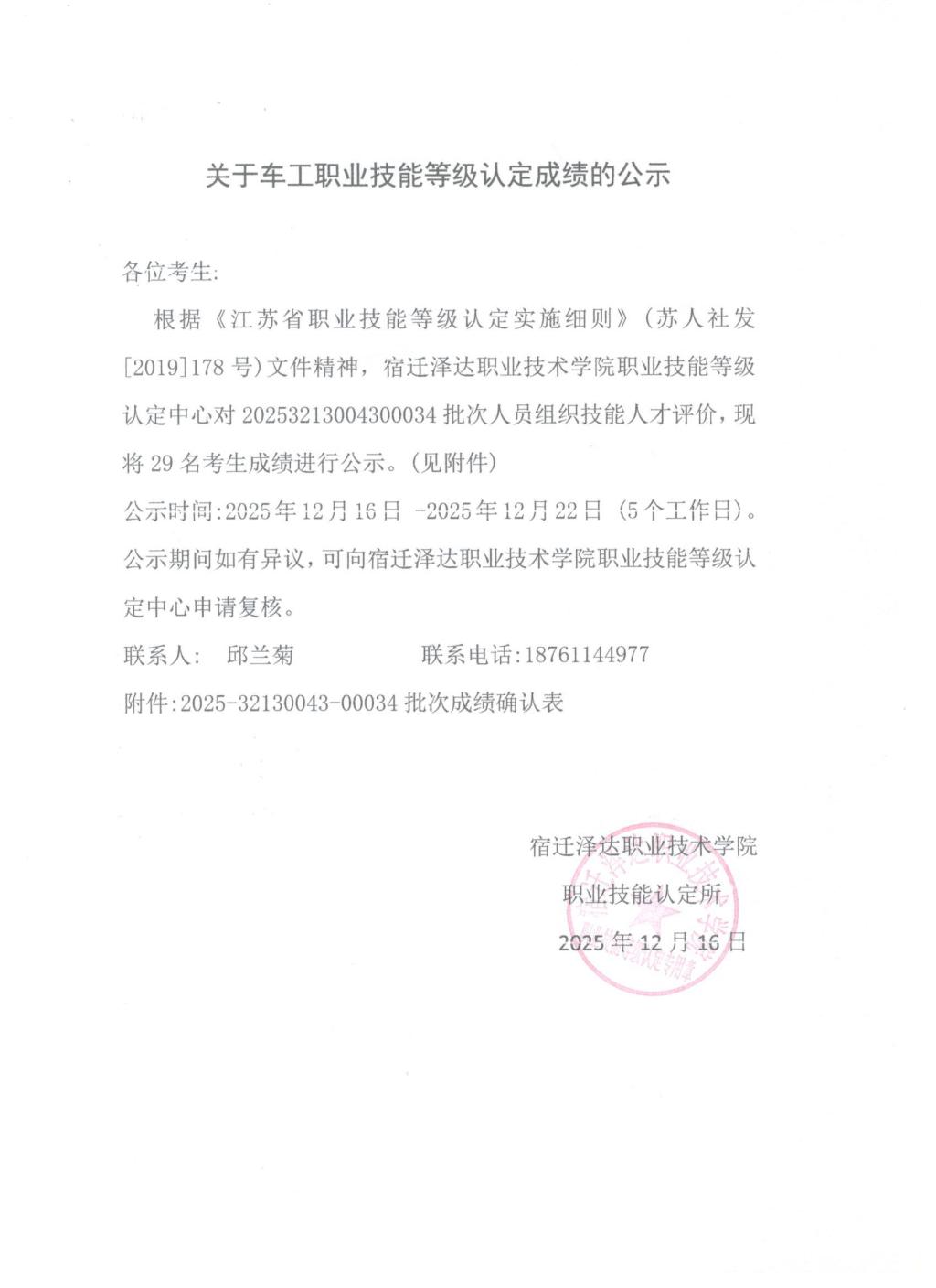 职业技能等级认定成绩公示(批次号2025-32130043-00034)
