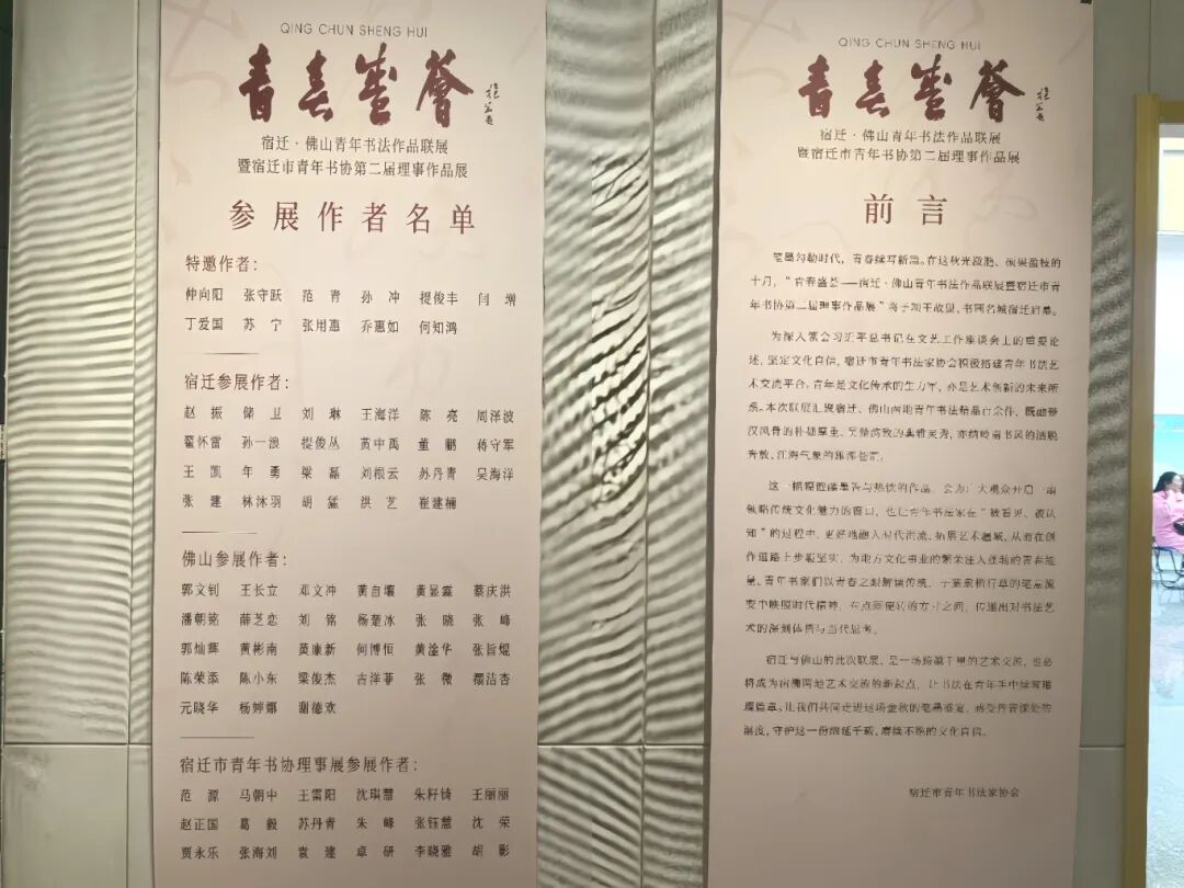 本次联展由宿迁市文化和广电旅游局、共青团宿迁市委员会、共青团佛山市委员会指导,宿迁市青年书法家协会、佛山市青年书法家协会主办,宿迁市美术馆、宿豫区书法家协会承办。佛山市书法家协会副主席郭文钊、黄显霖,宿迁市政协副主席刘培禄,宿迁市政协原二级巡视员、宿迁市发展促进会副会长仲向阳,宿迁市文化广电和旅游局党组书记、局长张智超,共青团宿迁市委副书记亓俊先,宿迁市画院院长张凡,宿迁市文联副主席、宿迁市美术馆馆长陆启辉,中国书法家协会楷书委员会委员、宿迁市书法家协会主席孙冲,中国书法家协会行书委员会委员、江苏省书法院专职书法家、宿迁市青年书法家协会名誉主席提俊丰等两地书法界代表出席开幕式。beat365兰亭书法社师生与百余位书法爱好者共同参加开幕式。
