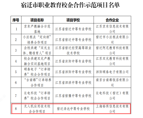 日前,2021年宿迁市职业教育校企合作示范项目评选结果揭晓,学校报送的《无人机应用技术校企合作项目》典型案例被评选为示范项目。