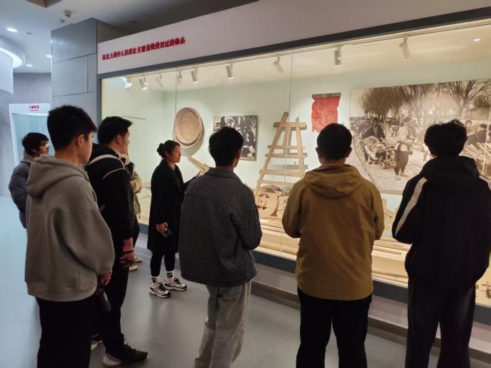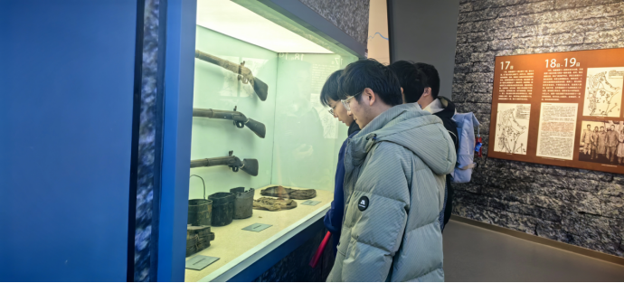 在纪念馆全景式展区,师生们跟随讲解员参观四个展区,通过数百余件珍贵文物、动态沙盘和影像技术,系统回顾了1946年华东野战军全歼国民党整编69师的战役过程,重点剖析了“集中优势兵力打歼灭战”的军事智慧与走群众路线的重要性。
