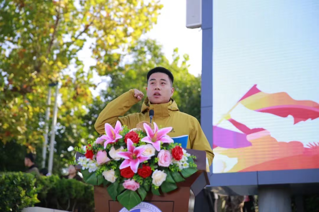 运动员代表国防教育学院王赞同学宣誓。他代表全体运动员郑重宣誓:在本次田径运动会中,将以积极、饱满、热情的态度参加比赛。遵守比赛规则和赛场纪律,服从裁判,尊重对手,团结协作,勇于拼搏,赛出风格,赛出水平。弘扬“更快、更高、更强、更团结”的体育精神,展现良好的体育道德风尚和精神风貌。
