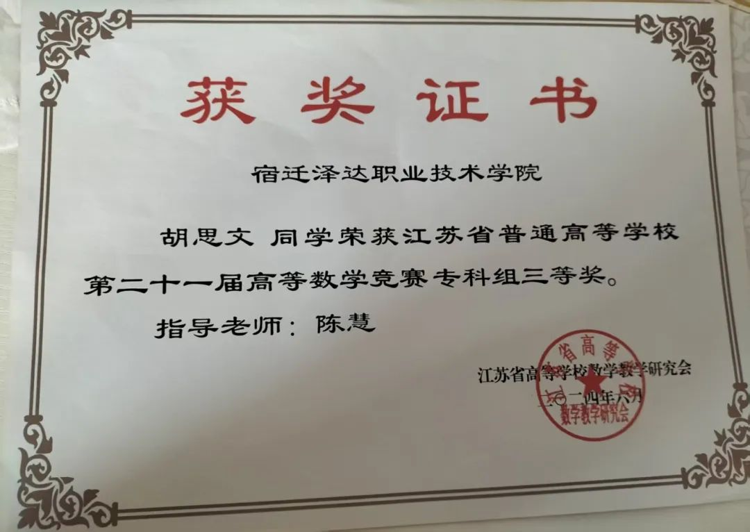 学术竞赛方面,学院学生也展现出了强大的实力。在江苏省普通高等学校第二十一届高等数学竞赛专科组中,胡思文同学获得了三等奖。在全国大学生英语词汇能力大赛省级赛事中,黄瑶同学获得省级三等奖 。