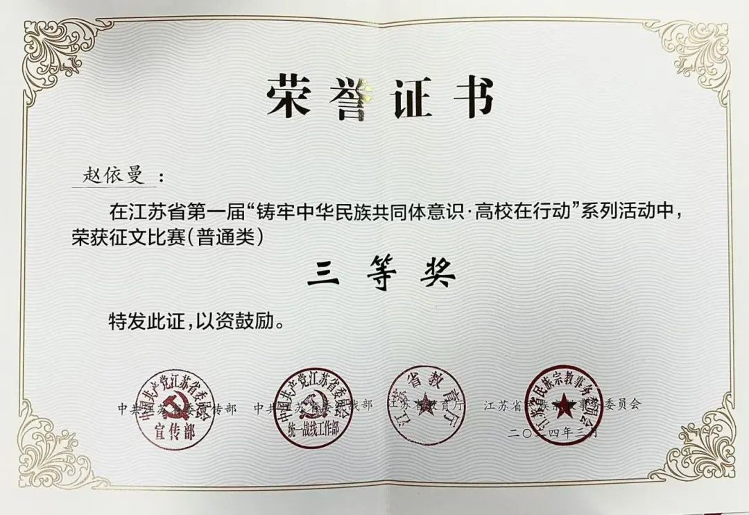 在文化与思想领域,学院积极响应国家对于中华民族共同体意识的弘扬与培育。2024 年,在省级征文比赛 “铸牢中华民族共同体意识” 中,学院学生踊跃参与,赵依曼同学凭借深刻的见解与流畅的文笔,在众多参赛作品中脱颖而出,荣获省级三等奖,其作品深入探讨了在经济管理专业学习中如何践行中华民族共同体意识,为学院争得荣誉。
