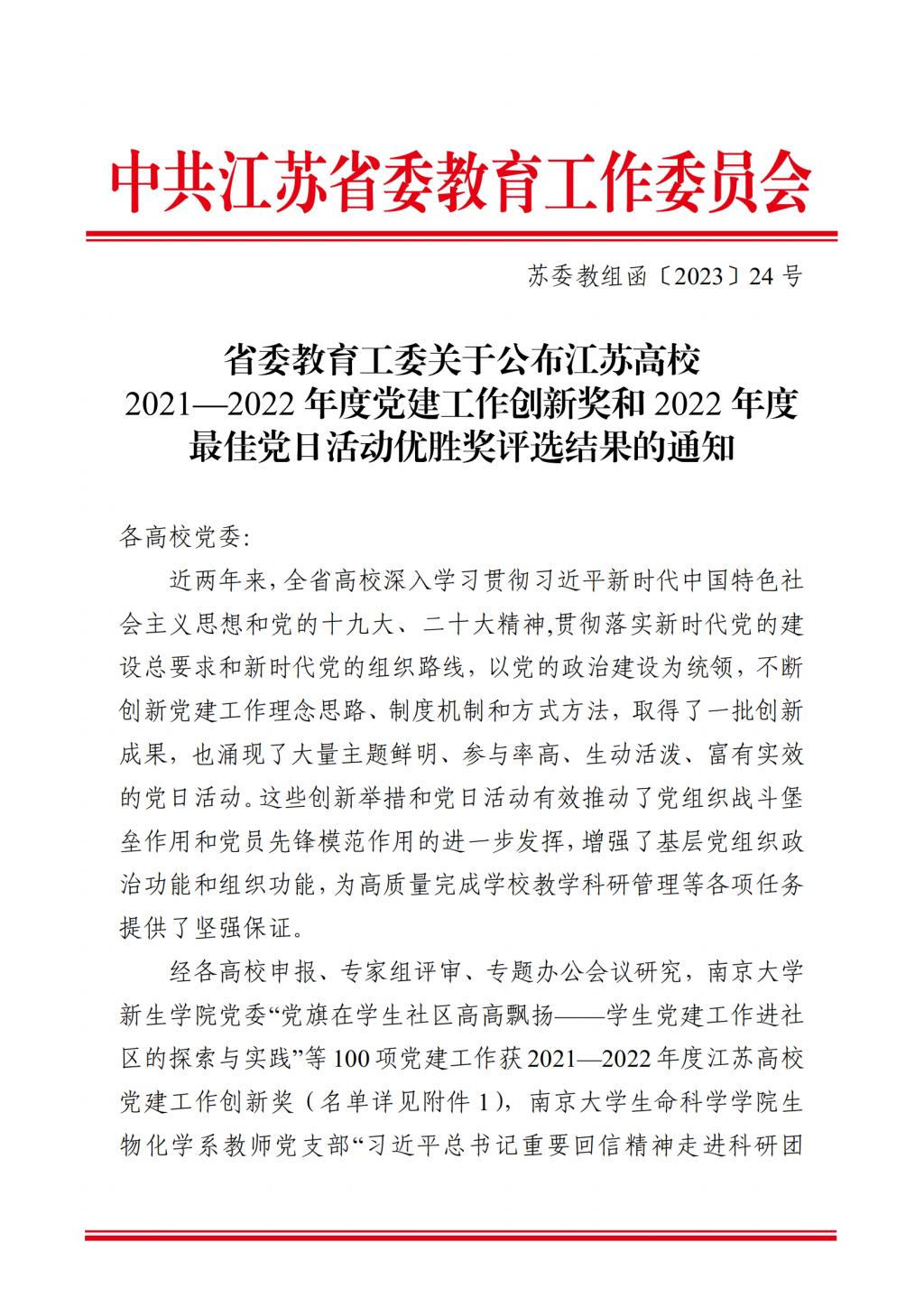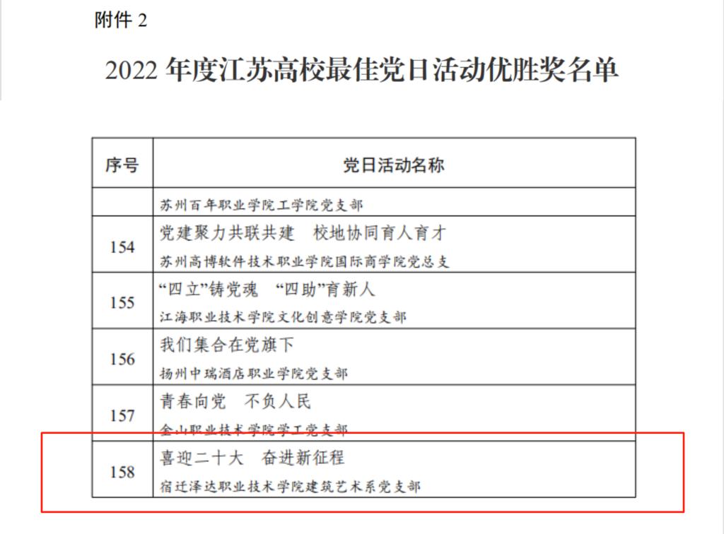 近日,中共江苏省委教育工作委员会公布了《省委教育工委关于公布江苏高校2021—2022年度党建工作创新奖和2022年度最佳党日活动优胜奖评选结果的通知》(苏委教组函〔2023〕24 号)。beat365建筑艺术系党支部的“喜迎二十大 奋进新征程”主题党日活动荣获2022年度江苏高校“最佳党日活动”优胜奖。